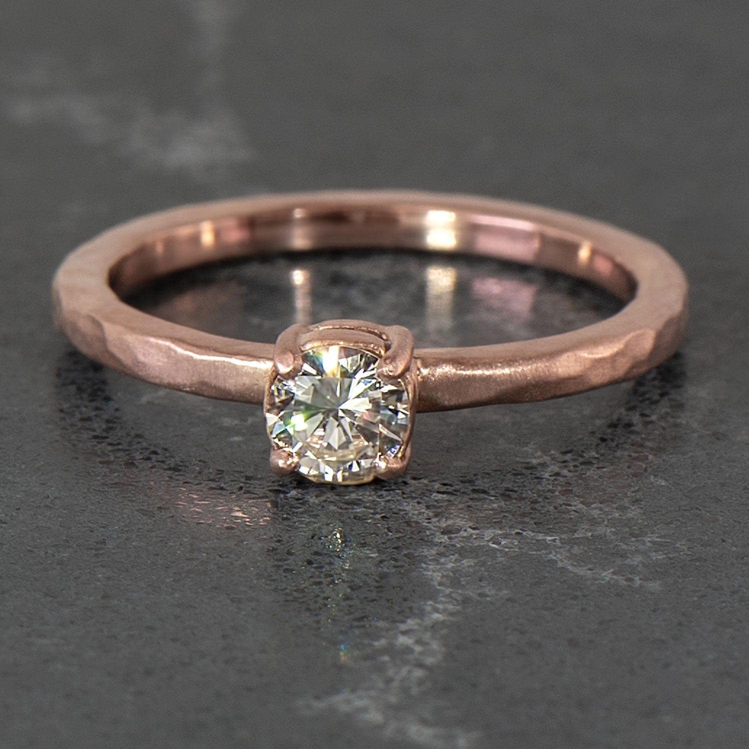 Hammered and satin finished 14k rose gold highlights the glitter of a solitaire 0.31 carat diamond, set in a classic 4 prong setting. A charming engagement band, it sits comfortably with other rings or on its own.